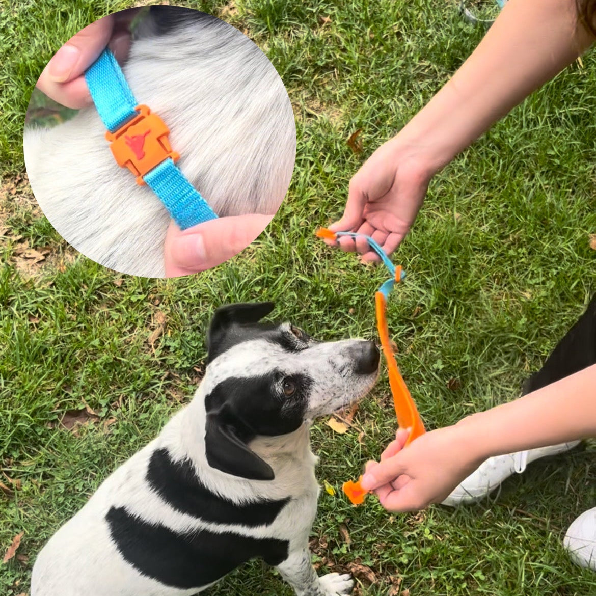 When your dog is a wiggle butt, our unique buckle system makes life easy! Our adjustable strap fits a wide range of doggos.