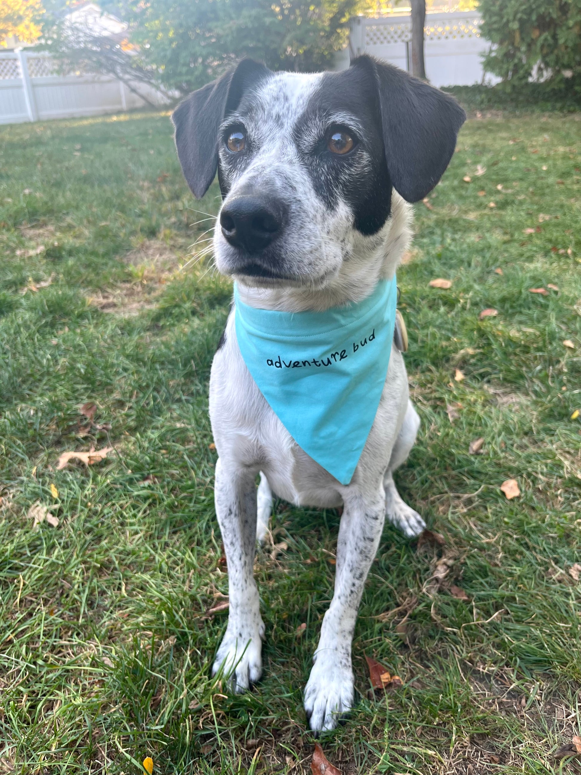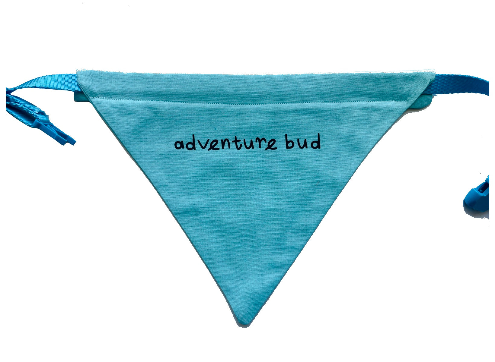 Take your dog everywhere? Love the outdoors? You need an adventure bud bandana! Blue bandana with navy blue text and blue adjustable strap.