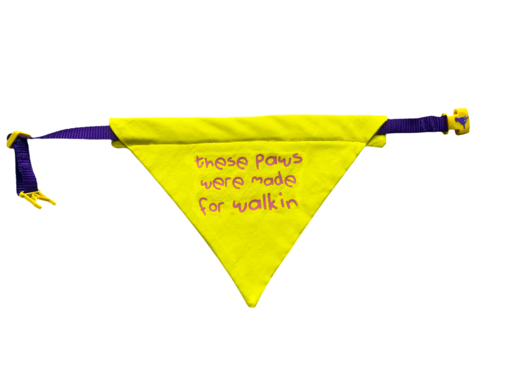 For the dogs who love their walkies! Yellow bandana with pink text and adjustable purple strap.