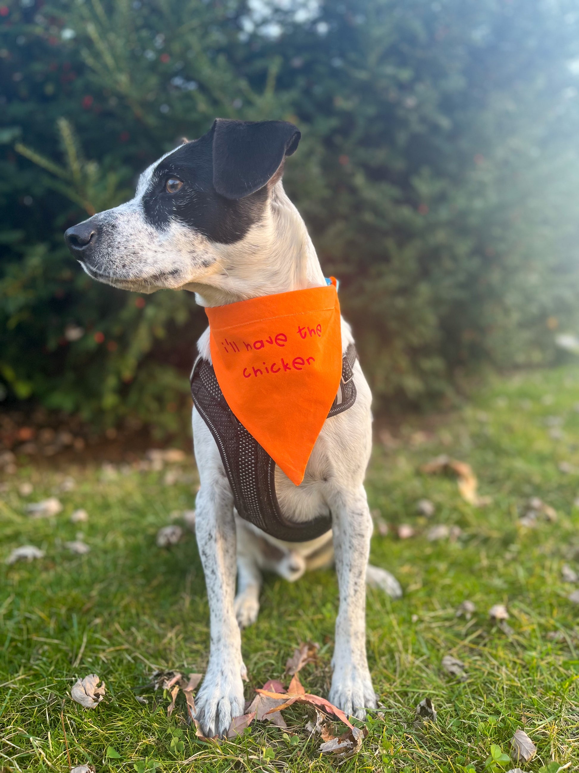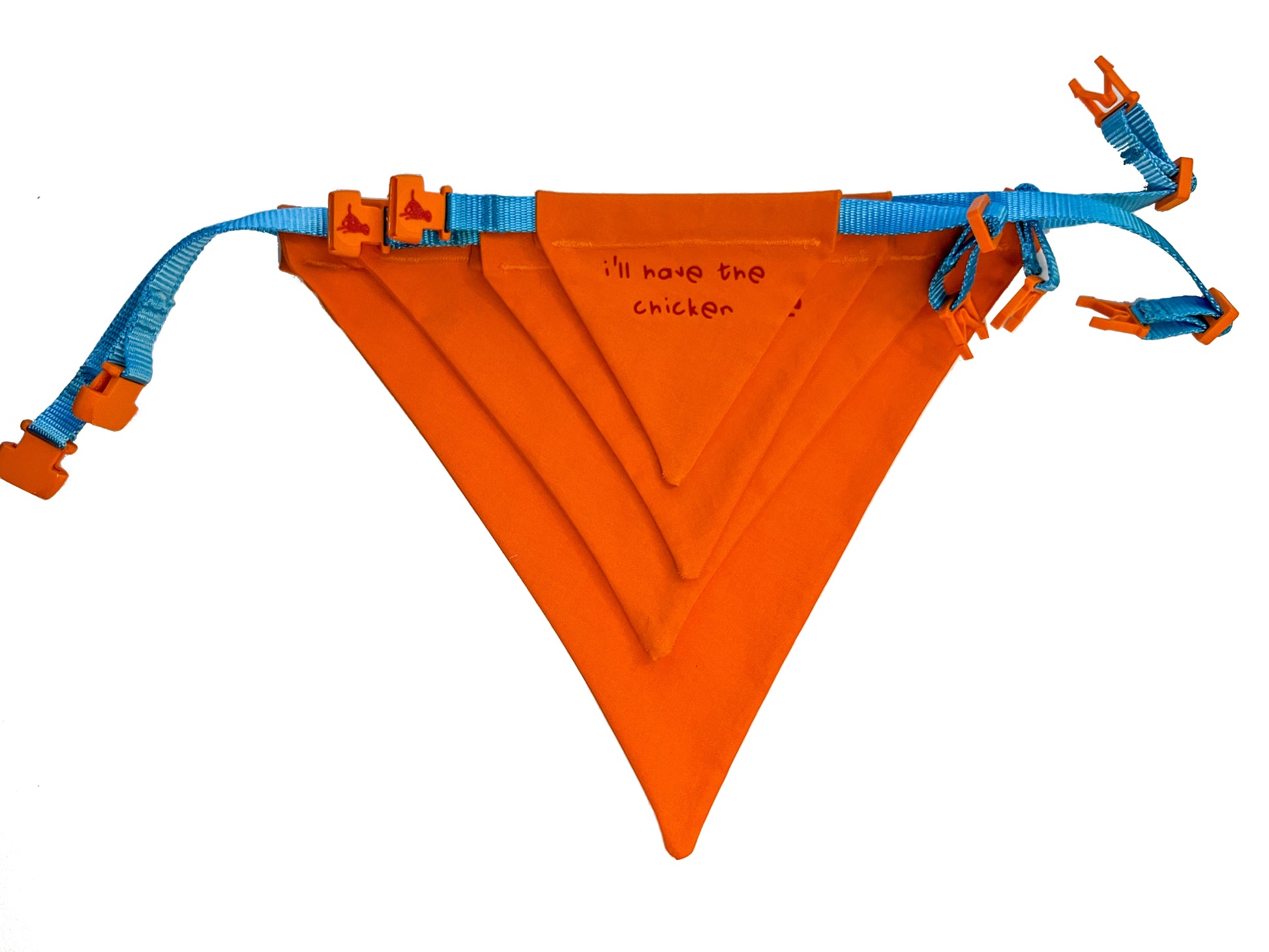 For your hungry pupper! That chicken smells so good. Orange bandana with blue adjustable strap and orange buckle.