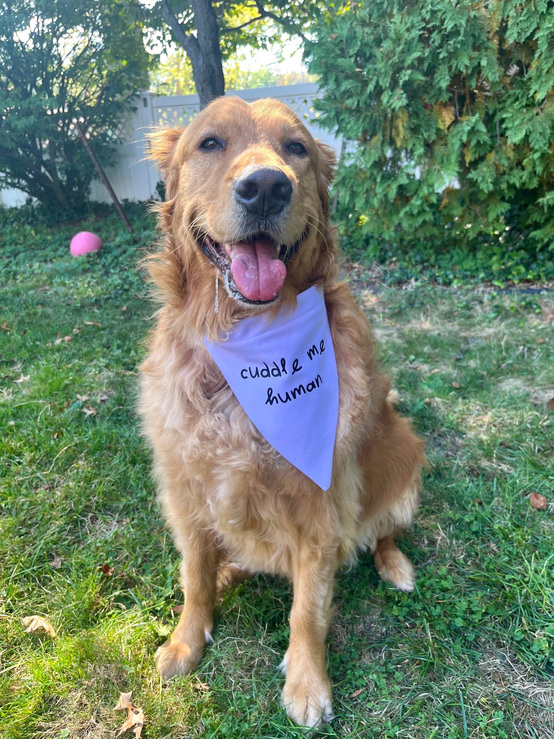 They need a cuddle and they need it now! Perfect for your cuddle bug. Purple bandana with navy blue text and purple adjustable strap.